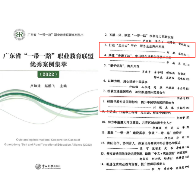 现场进行了《广东省“一带一路”职业教育联盟优秀案例集萃(2022)》发布仪式。案例集萃汇聚了19家联盟成员院校的优秀合作案例,充分展示了院校国际化办学及参与“一带一路”教育行动的成效,聚集智慧、凝心聚力,为职业院校间互学互鉴、共同提升提供了良好的范例。我校外事办刘聪老师等撰写的两篇案例《打造“走出去”平台服务企业海外发展》以及《研制导游专业国际标准提升中国职教国际影响力》集中总结并展示了我校在国际化办学的经验与成绩,其中《打造“走出去”平台服务企业海外发展》围绕“一带一路”倡议,推进共建“一带一路”教育行动,通过与中国有色矿业集团有限公司在赞比亚共建中国一赞比亚职业技术学院广东工贸分院、在印度尼西亚开办“中文+职业技能”中文工坊,开展企业境外员工技术技能培训、招收留学生等,精准对接企业的海外人才需求和当地社会经济发展需要,探索与中国企业和产品“走出去”配套的职业教育发展模式,为中国职教“走出去”提供智力支持,对国内院校国际化发展起到引领示范作用,赋能“一带一路”倡议与国际产能合作,贡献中国方案和中国智慧。