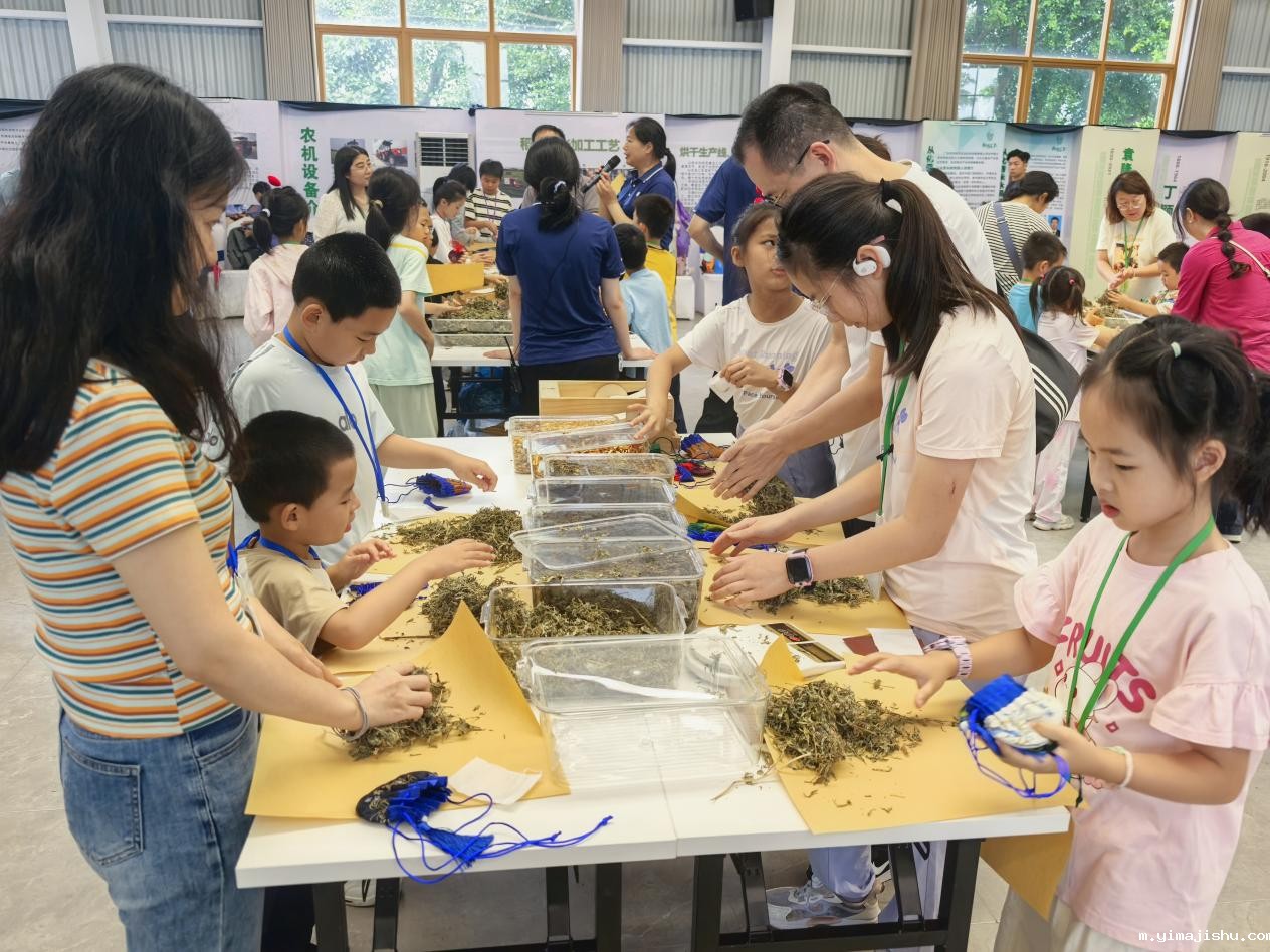 午饭后,基地展厅飘起淡淡艾草香——亲子家庭正协同制作中药香囊与手工艾条。讲师边示范边讲解:“艾草能驱蚊安神,薄荷能清凉提神,这些都是老祖宗的智慧。”家长与孩子制作艾绒,孩子用工具尝试制作艾条,家长为孩子称香料,孩子往香囊里放香料。不一会儿,绣着“平安”“健康”的香囊便挂满桌面。总结环节基地还为每位小朋友颁发研学证书和零食大礼包,孩子们举着证书、制作手工和收获的零食礼包在场地中尽情奔跑。活动在孩子们与家长的欢声笑语中落下帷幕。