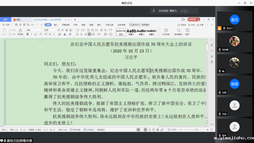 2021年8月18日,测绘遥感信息学院教师第二党支部在腾讯会议召开党史学习会议,学习习近平总书记在2020年10月23日发表的《在纪念中国人民志愿军抗美援朝出国作战70周年大会上的讲话》。会议由党支部书记黄铁兰老师主持,支部全体党员老师共同参加学习。