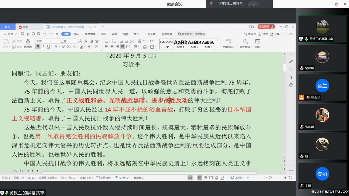 测绘遥感信息学院教师第二党支部于2021年8月20日,在腾讯会议召开党史学习专题研讨会。会议由支部书记黄铁兰同志主持,全部支部成员参加。黄铁兰同志带领大家认真学习了习近平总书记《在纪念中国人民抗日战争暨世界反法西斯战争胜利75周年座谈会上的重要讲话》内容,重温抗日战争历史。