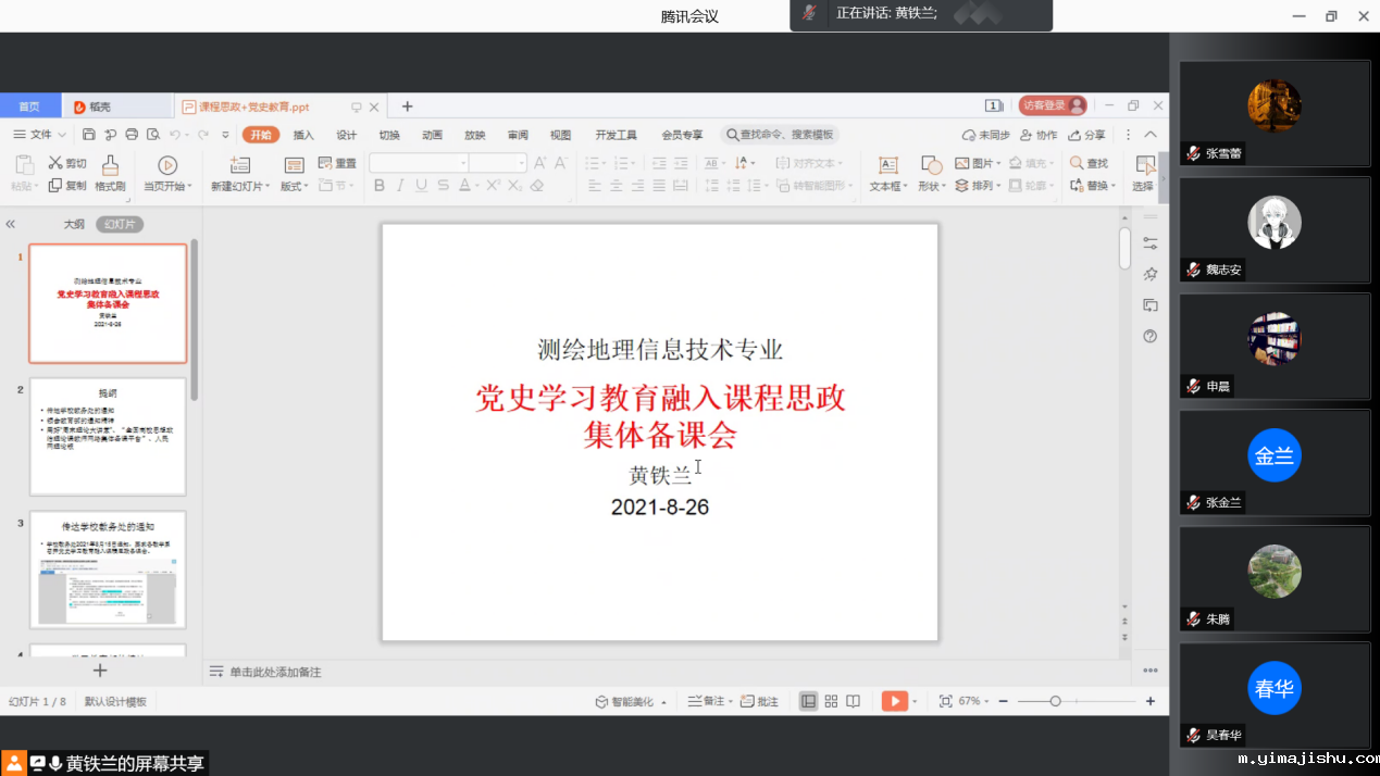2021年8月26日,测绘地理信息技术专业组织开展了“党史学习教育融入课程思政集体备课会”。会议由教师第二党支部书记、测绘地理信息系主任黄铁兰主持,测绘地理信息专业教师常德娥、喻怀义、张金兰、吴春华、朱腾、申晨、魏志安、张雪蕾老师参会。本次会议共分为四个议题。