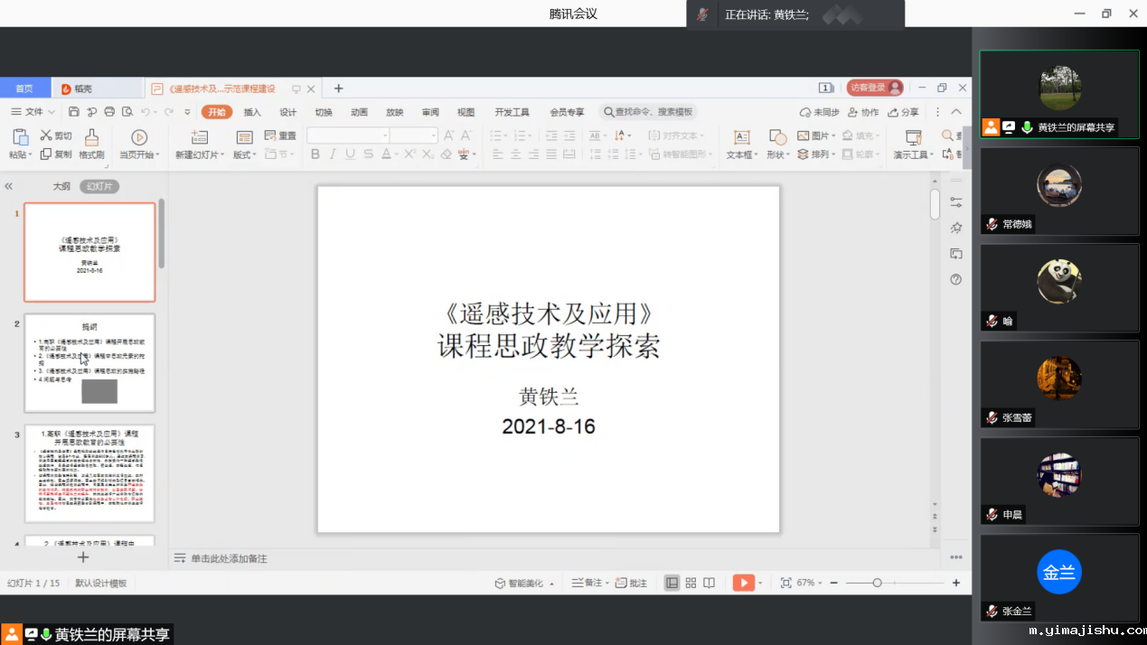 会议的第二议题,是各课程负责人分享在课程思政建设过程中的思路和方法。首先,由常德娥老师作了关于《GIS技术及应用》课程的课程思政元素内容建设分享。常老师从课程内容设计和课程思政元素挖掘两方面向大家详细介绍了各项目。接着,黄铁兰老师分享了《遥感技术及应用》课程思政教学探索的分享。黄老师从课程开展思政教育的必要性、课程思政元素的挖掘、课程思政的实施路径、课程思政案例展示、课程思政的问题及展望五个方面进行了详细的阐述。然后,由张金兰、喻怀义、吴春华、朱腾等老师,分别分享了《地图制图技术及应用》、《测量技术基础》、《GIS空间分析》、《科技论文写作》等课程中如何开展课程思政建设的思路。