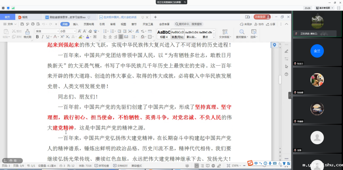 2021年7月18月,按照暑假党史学习计划,测绘学院教师第二支部通过腾讯会议召开党史学习研讨会,深入学习《习近平总书记在庆祝中国共产党100周年庆祝大会的讲话》。会议由党支部书记黄铁兰同志主持,第二支部全体党员参加。