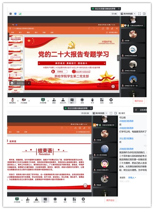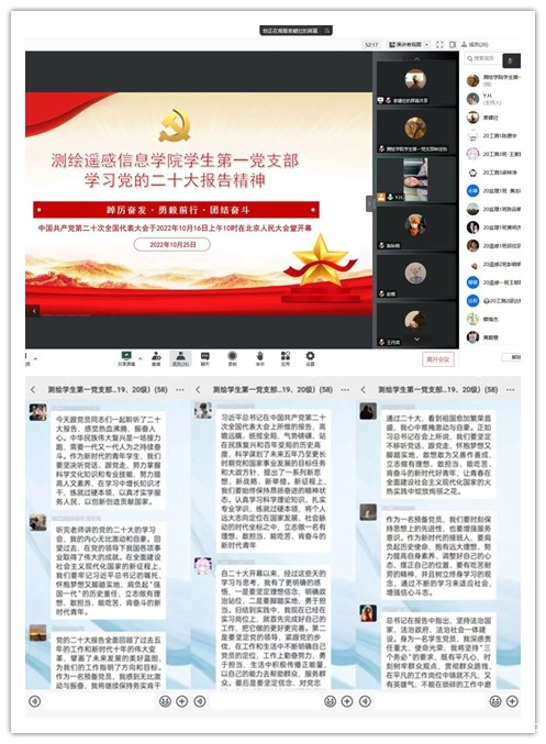 为认真学习宣传贯彻落实党的二十大精神,根据学校党委《关于开展党的二十大精神专题学习的通知》安排及疫情防控的有关要求,10月25日下午及晚上,测绘遥感信息学院师生党支部分别以线上会议形式组织师生党员开展党的二十大精神专题学习活动。