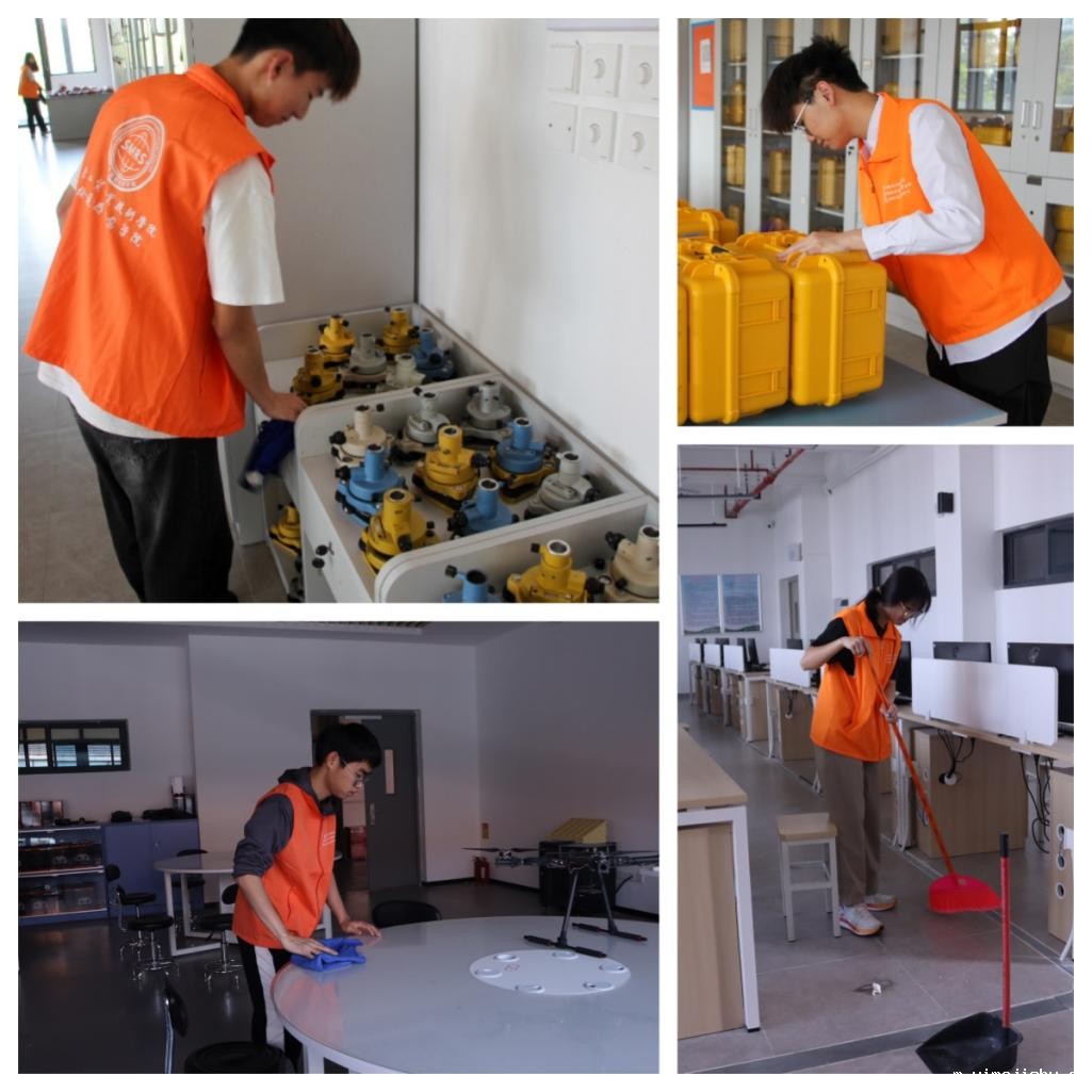 活动当天,学生支部成员身着红色志愿马甲分类垃圾袋,走进测绘学院各个实训室,对绘图桌夹缝中的橡皮屑、仪器存放区的包装盒进行细致清理。针对精密设备,同学们使用专用清洁布和酒精棉片,在实验员指导下规范擦拭。