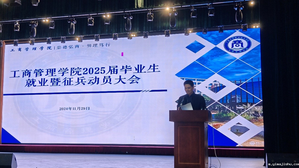 为全面贯彻党的二十届三中全会精神和全国教育大会精神,推进毕业生就业创业工作和大学生征兵工作的决策部署,全力做好2025届毕业生就业创业指导服务和征兵工作,工商管理学院于11月29日在白云校区学生活动中心报告厅面向学院全体2025届毕业生召开了就业暨征兵动员,学校党委委员、副校长唐毓秋出席会议并发表讲话,工商管理学院党总支书记周清莲、副书记谢宏祥及毕业班辅导员、班主任参加了会议,会议由谢宏祥主持。