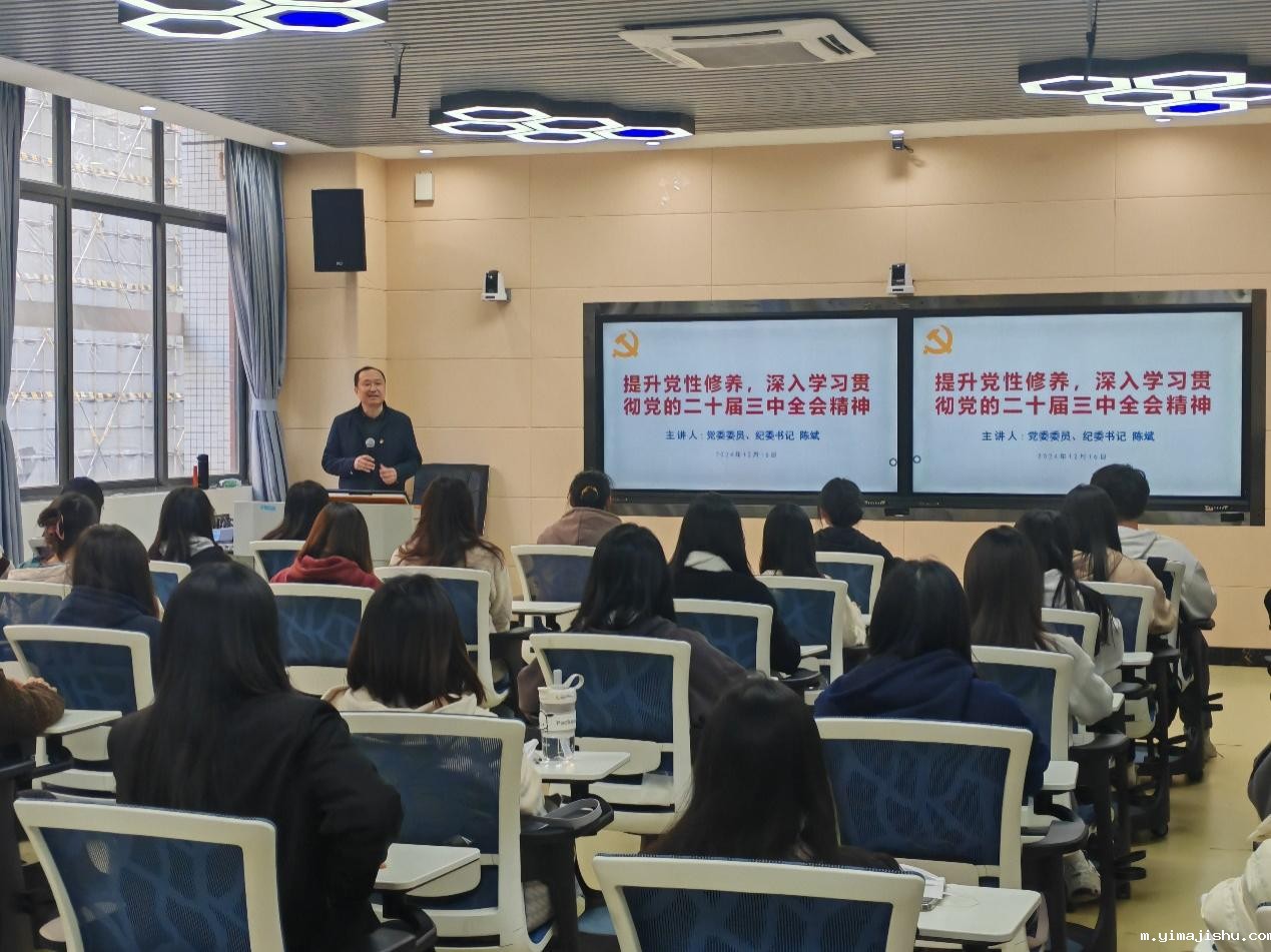 陈斌对党的二十届三中全会精神进行解读,重点围绕《中共中央关于进一步全面深化改革、推进中国式现代化的决定》中明确要求聚焦提高党的领导水平和长期执政能力,健全全面从严治党体系方面开展讲述,指出《决定》充分体现了以习近平同志为核心的党中央坚持用改革精神和严的标准管党治党、以党的自我革命引领社会革命的高度自觉,突出了中国共产党自我净化、自我完善、自我革新、自我提高的能力,让学生党员深刻领悟“两个确立”的决定性意义,明白增强“四个意识”、坚定“四个自信”、做到“两个维护”乃是自身义不容辞的责任。